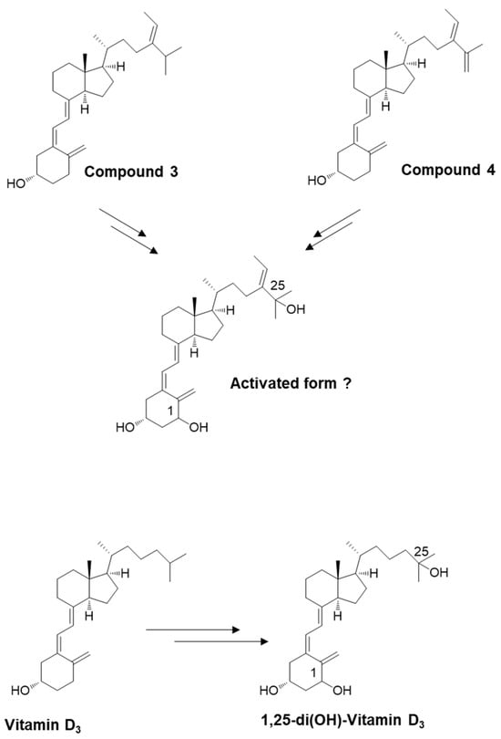Schematic depicting the potential for converting newly synthesized compounds into their activated forms. The introduction of an OH group at position 25 (in the liver) and position 1 (in the kidney). Similar to vitamin D3, compound 3 appears likely to undergo conversion to an activated state.