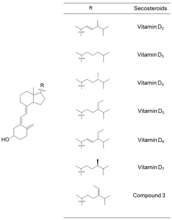 Chemical structural formulas of vitamins D2–D7 and compound 3. These secosteroids were transformed into the structural formula of 1,25-di(OH) for input into the PASS online tool to estimate their biological activity.