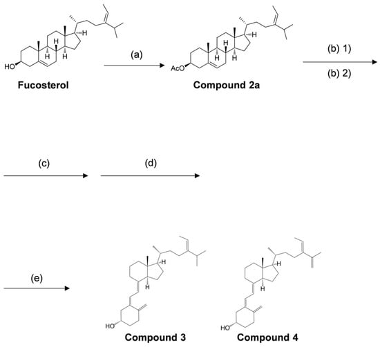 In the present study, we performed the organic synthesis of secosteroids, which could be new vitamin D candidates. Compounds 3 and 4 were synthesized starting from fucosterol. Compound 4 contains an extra double bond. The rationale is as follows: The hydroxy group of fucosterol was first acetylated, followed by the Wall–Ziegler reaction [,,,] to brominate the allyl position. This bromination likely occurred at both the 7 and 25 positions of the fucosterol. Subsequent treatment with tetrabutylammonium fluoride led to synthesizing the desired compound with a ∆5,7-diene and another compound containing a ∆5,7-diene and an additional double bond between C25 and C27. To the best of our knowledge, both compounds 3 and 4 are novel secosteroids.
