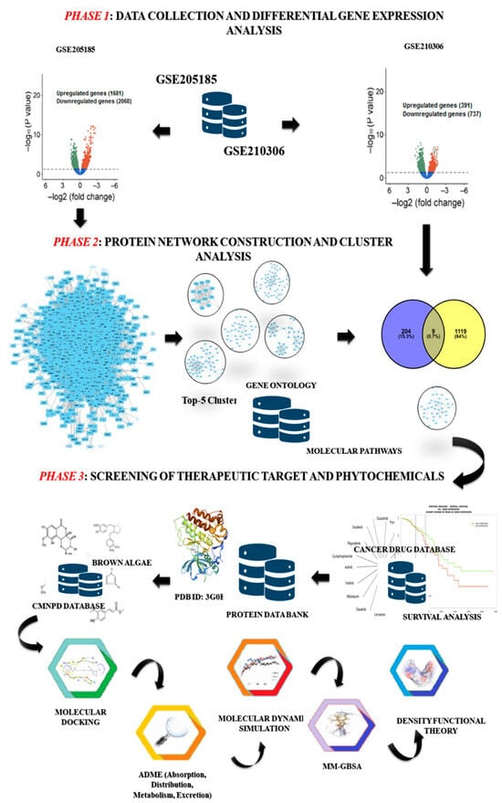 Here, we have used a set of computer methods (shown in Figure 1) that combine the gene expression profiles of primary and radioresistant breast cancer (RRbc) to build a protein network and find a potential therapeutic target for RRbc. Also, we used molecular docking and ADME (absorption, distribution, metabolism, and excretion) to screen the phytochemicals of brown algae against the chosen RRbc target to find a possible drug candidate. Furthermore, a molecular dynamics (MD) simulation was performed that demonstrates the conformational stability of the protein–ligand complex, and the execution of density functional theory (DFT) provided the quantum chemical properties of the drug candidate against the protein target. In addition, molecular mechanics with a generalized Born and surface area solvation (MM-GBSA) calculation confirm the high binding affinity and stable conformation of the drug candidate with the RRbc target.