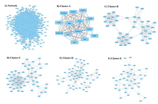 (A) Comprehensive protein interaction network of genes encoding proteins associated with primary breast cancer. The top five clusters (B–F) highlight the core functional segment of the protein network.