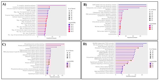 To construct the protein–protein interaction (PPI) network, the DEGs obtained from the analysis of GSE205185 were subjected to the Gene mania plug-in, Cytoscape software version 3.9.1 [32]. In the constructed network, nodes depict proteins, and the edges represent their interactions. Using the Cytoscape MCODE plug-in, the entire protein network was dissected to have multiple hubs called clusters that describe the core functional components of the PBC network with highly interconnected edges [33]. From the generated clusters, the top five clusters were selected and subjected to ShinyGO (http://bioinformatics.sdstate.edu/, accessed on 26 June 2023) for ontological and pathway analysis. ShinyGO is a graphical web tool that provides large annotations for the inputted protein list to evaluate their functional importance, such as gene ontology (molecular function, biological processes, and cellular components) and molecular pathway [34].