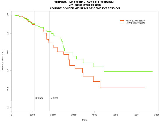 A survival plot indicating that increased KIT expression decreases the survival rate of patients with breast cancer.