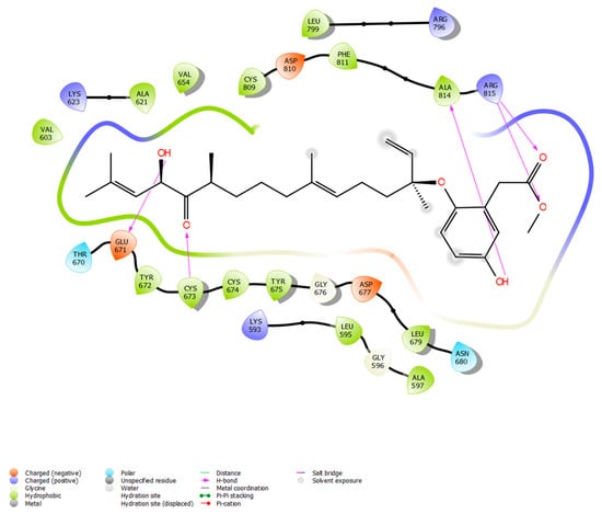 Following a search in the Comprehensive Marine Natural Products Database (CMNPD), a set of phytochemicals sourced from brown algae (n = 1212) was collected for subsequent molecular docking against the KIT target protein. The phytochemicals were retrieved in SDF format and then optimized using the Ligprep module in the Maestro 11.2 Schrödinger software. Simultaneously, the protein structure and the inhibitor binding sites of the KIT target were acquired from the protein data bank (PDB ID: 3G0E). Then, using the receptor grid generation module, the grid (30 × 30 × 30 A°) around the binding sites (CYS673, GLU671, ALA621, VAL603, CYS809, PHE858, GLY676, CYS674, LEU595, and ASP677) was generated. Further, molecular docking was executed with the Glide module to investigate the binding efficiencies of 1212 phytochemicals with the KIT target. The favorable binding pose was selected based on the Glide score, which reflects the binding affinity between the phytochemicals and the target protein (Table 1). From the 1212 phytochemicals that were docked, the five phytochemicals with the lowest Glide score were chosen. Among the top five, nahocol-A1 had the lowest Glide score (−8.56 kcal/mol) and the most favorable interactions with the KIT target. Notably, nahocol-A1 formed six hydrogen bonds with the critical residues CYS673, GLU671, ALA814, and ARG814 of the binding site, as depicted by the molecular interaction plot (Figure 6). Then these selected phytochemicals were subjected to the QikProp module for ADME screening (Table S1). The QikProp module (Maestro 11.2 version, Schrödinger software) utilized pharmacological and physicochemical properties to screen the molecules and provide a star score value (the lower the star score, the higher the drug-like properties). Herein, the phytochemicals with a star score of less than five were screened to confirm their drug-like properties. Of the top five phytochemicals analyzed, nahocol-A1, 4′-chloro-2-hydroxyaurone, mediterraneol B, and (2E,6E,10E)-1-(2,5-dihydroxy-3-methylphenyl)-13-hydroxy-3,7,11,15-tetramethylhexadeca-2,6,10,14-tetraen-5-one were found to have drug-like properties, with star scores of less than five, with the exception of ishigoside (star score: 12, above our cut-off).