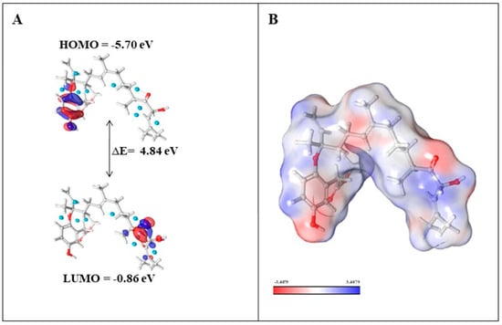 (A) Energy levels of nahocol-A1 at the highest occupied molecular orbital (HOMO) and lowest unoccupied molecular orbital (LUMO); (B) molecular electrostatic potential of nahocol-A1.