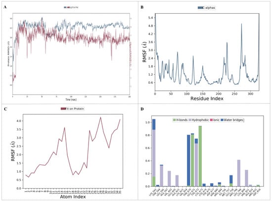 Molecular dynamics simulation provides insights into the dynamic behavior and conformational changes of a biomolecular system over time. (A) RMSD plot of the protein–ligand complex; (B) RMSF plot of the target protein; (C) RMSF plot of the ligand; and (D) protein and ligand interaction plot.