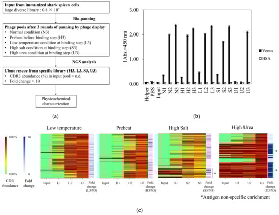 In this study, we aimed to distinguish VNARs with unique properties based on the physiological characteristics of sharks and physicochemical properties of VNARs from a large number of other clones under the condition of reduced diversity due to expression bias in E. coli. We applied an approach that combines selection pressure and NGS analysis to VNAR screening using phage display technology and verified its usefulness in solving this problem. We used the library produced in a previous study and enriched the VNARs under various selection pressures [24]. The selection pressures examined included conditions that mimicked the unique blood environment of sharks (high salt concentration, high urea concentration, and low temperature) and conditions that leveraged their distinctive physical properties of VNARs (preheating). An overview of the enriched VNAR library was analyzed via deep sequencing using NGS. Analysis of physicochemical properties is important to verify the usefulness of our approach for VNAR acquisition. Since the VNAR screening method has been rarely investigated, the selected antibodies have been insufficiently evaluated from the viewpoint of physicochemical properties. Therefore, to verify the usefulness of our method, we analyzed the interaction with the antigen (ELISA, Isothermal Titration Calorimetry (ITC) and Surface Plasmon Resonance (SPR)) and thermal stability (Differential Scanning Calorimetry (DSC)) of the obtained clones. Based on the data obtained in this study, we discussed a novel selection method for industrially useful shark antibodies.