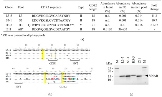 Figure 2a shows clones that satisfied the following criteria: CDR3 abundance in input = n.d., fold change > 10, and antigen-binding activity. No VNAR satisfying this criterion can be selected in the U3 pool. Although the enrichment patterns of L3, S3, and H3 were similar to those of N3, condition-specifically enriched clones were selected.