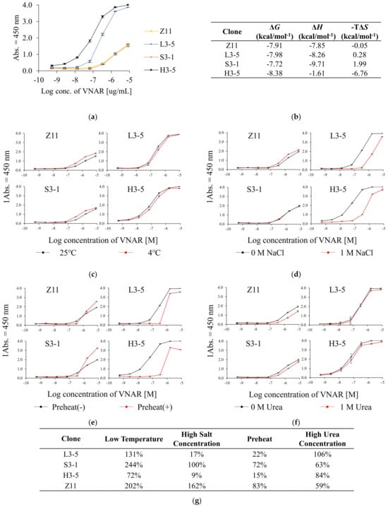 We compared the reactivity of Z11 and the condition-specifically enriched VNARs by ELISA under normal conditions (Figure 3a). The EC50 under normal conditions was 3.0 × 10−7, 1.3 × 10−6, 9.0 × 10−8 and 1.3 × 10−6 M for L3-5, S3-1, H3-5 and Z11, respectively. The selected clones showed reactivity equal to or higher than that of Z11. Clones present at a low frequency in each pool showed higher antigen reactivity than those detected by the conventional method, demonstrating the practicality of this method. Figure 3b shows the ITC analysis data. Figure S1 shows the details of the ITC analysis. Z11, L3-5, and S3-1 were enthalpy-driven interactions, whereas H3-5 was entropy-driven.