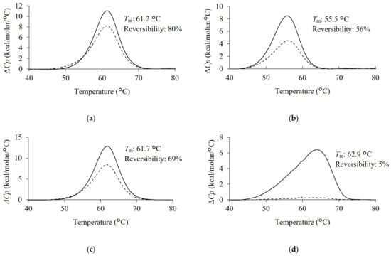 Thermogram of each VNAR clone. (a) Z11, (b) L3-5, (c) S3-1, (d) H3-5. The concentration of purified VNAR in PBS was set to 1 mg/mL. DSC measurement was performed at a scanning rate 1.0 °C/min from 30 °C to 90 °C. Solid lines indicate the first scan. Dotted lines indicate the second scan. Tm value and the reversibility were shown next to each peak.