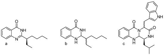 Bioactive quinazolinone (a), dihydroquinazolinone (b), and indolylmethylpyrazinoquinazoline (c) obtained from or inspired by marine sources.