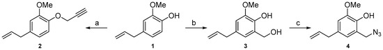 Synthesis of 4-allyl-2-methoxy-1-(prop-2-ynyloxy)benzene (2), 5-allyl-2-hydroxy-3-methoxybenzyl alcohol (3), and 2-[(azidoacetyl)amino]benzoic acid (12)