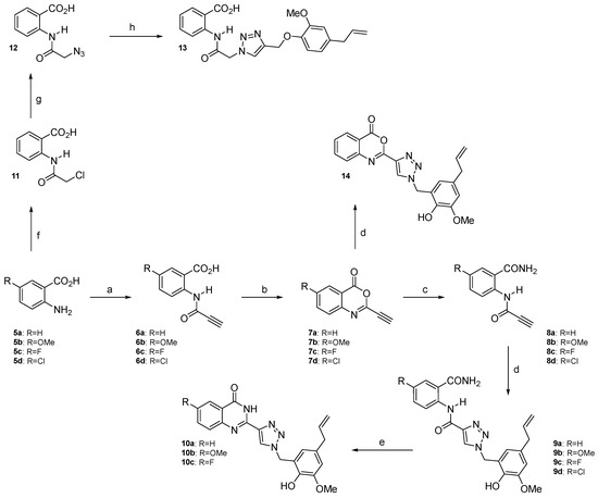 The amides 6b–6d, benzoxazinones 7b–7d, and 2-acylamino-benzamides 8a–8d were found to be quite unstable, decomposing rapidly during purification and characterization attempts. Thus, intermediates 8a–8d were used in crude form for the synthesis of triazole intermediates 9a–9d, while intermediates 12 and 7a could generate the additional triazoles 13 and 14, respectively. These and the other triazoles (9a–9d) were prepared by the copper catalyzed azide–alkyne cycloaddition reaction, following the classical click procedure described elsewhere [25]. The signal relative to the triazole hydrogen of products 9a–9d, 10a–10c, 13, and 14 was clearly observed in the range of 8.25–8.62 ppm.