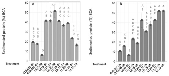 Then, to calculate the sedimented protein (%) and sedimented phosphorus (%) after the flocculation treatments, Equation (2) was used.