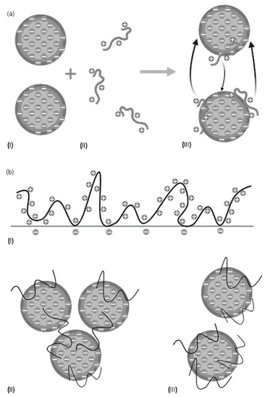 Flocculation mechanisms. (a) Electrostatic patch mechanism. (I) Particle with negative charge. (II) Flocculants with high charge density and low molecular weight. (III) Attraction of opposite charges. (b) Polymer bridging mechanism. (I) Polymer adsorption and loop formation. (II) Polymer bridging with other particles. (III) Restabilization. (Modified from Sharma et al., 2006 [19]).