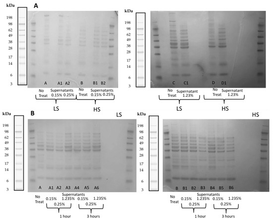 Polypeptides in the process waters, LS and HS, before and after the treatments with Levasil RD442 at different concentrations without a maturation period are shown in Figure 3A. It was possible to identify that process waters LS and HS without treatment had some differences in their molecular weight distribution of the polypeptides present. The gel showed a clear band above 198 kDa for LS; this one could not be observed in HS. Also, process water HS showed more bands between 38 and 98 kDa than LS.