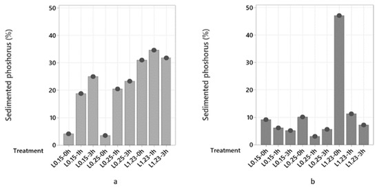 Sedimented phosphorus (%) after treatments with Levasil RD442 0.15% with 0, 1 and 3 h of maturation period (L0.15–0 h, L0.15–1 h, L0.15–3 h), Levasil RD442 0.25% with 0, 1 and 3 h of maturation period (L0.25–0 h, L0.25–1 h, L0.25–3 h) and Levasil RD442 1.23% with 0, 1 and 3 h of maturation period (L1.23–0 h, L1.23–1 h, L1.23–3 h) of process waters LS (a) and HS (b).