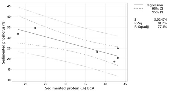 Linear regression between sedimented phosphorus (%) and sedimented protein (%) after treatment with Levasil RD442 at concentration of 0.15%, 0.25% and 1.23% and maturation periods of 1 and 3 h of process water LS. Sedimented phosphorus (%) = 43.15–0.5071 × (Sedimented protein (%) BCA). The variables have a statistical difference (p = 0.013), and there is a strong relationship between them (R-Sq = of 81.7%) and a negative slope, which means that the sedimentation of phosphorus depend on the protein sedimentation, being inversely proportional.