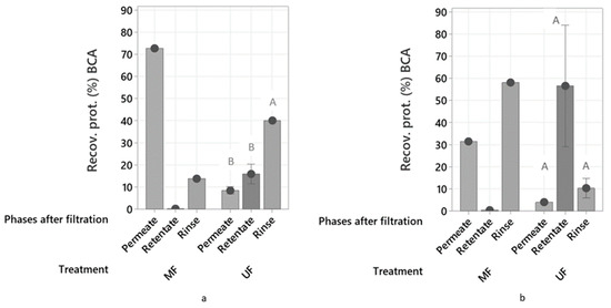 Recovered protein (%) in the phases after filtration calculated from protein content using the BCA method after treatment of process water LS (a) and HS (b) using microfiltration (MF) and ultrafiltration (UF) membranes. Standard deviations and Tukey analysis are also presented. The capital letters above the bars are the results from the Tukey comparison analysis and different letters indicate significant differences.