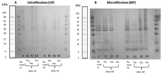 On the other hand, bands in the permeate phase were clearly identified after the microfiltration process of both process waters, where it is required to ideally not find proteins. In the case of the process water LS, the permeate phase showed almost the same bands compared to the untreated sample, but a difference was that some bands between 49 and 98 kDa appeared with more intensity. The opposite occurred in the permeate phase after the treatment of HS, in which the bands were weaker. The retentate phase of both samples were identified, but both with less intensity in some bands compared to the untreated process waters. And even though the size of the pores of the microfiltration membrane is large enough to let the proteins pass to the permeate side, it was possible to find polypeptides in the rinse phase, meaning that the device utilized to perform this treatment was not the most adequate. The bands in the rinse phase of process water LS were almost not visible, while it was possible to identify some in the rinse phase of process water HS.