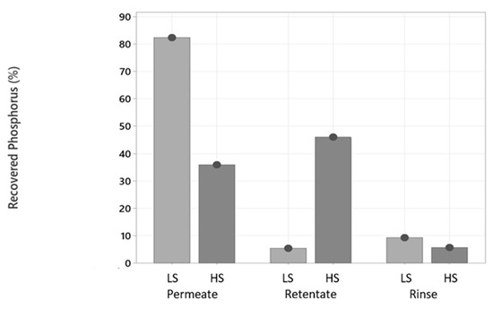 Figure 8 shows that a great part of the phosphorus (82.4%) passed the ultrafiltration membrane in the treatment of process water LS. This made sense because phosphorus in the form of phosphate is an ion that has a size that lets it pass to the permeate side [18] together with other small molecules, such as water. In process water HS, the recovered phosphorus was slightly different in the permeate and retentate phases (36.0% and 46.0%, respectively). As mentioned in the previous section, the higher density with the presence of bigger particles in HS could form intermolecular forces with proteins, that also attached phosphate ions through ion–dipole interaction and brought them to the retentate side, while some were able to pass the ultrafiltration membrane. It is also possible that higher amounts of salts enhanced the interaction between phosphate groups and protein, making them go together, when phosphate was supposed to go directly to the permeate side, as occurred after the ultrafiltration treatment of LS.