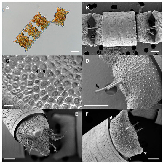 Our morphological observations revealed that our isolate exhibited several features that are consistent with the characteristics of the genus Odontella. These features include bipolar valves, two elevations at the apices with rimmed ocelli at the summits, two types of pore occlusion, a distinct expanded hyaline valve margin with an upturned rim, rimoportulae located in the subcentral position, valvocopula extending beneath the flange, and chain formation [35]. The morphological characteristics of the isolate are outlined in detail below and illustrated in Figure 1. The cells were strongly silicified, with an apical axis measuring 25–51 μm (n = 16). Numerous small circular or elliptical chloroplasts were observed adhering to the cell wall (Figure 1A). The cells typically exhibited colony formation characterized by a zigzag pattern, with a single horn connecting them, or a linear colony formation, with both horns serving as points of connection (Figure 1A). Valves were more or less elliptical (bipolar), with two obtuse horns (elevations) and an ocellus at each pole. There was also a distinct convex area between the horns (Figure 1A,B,F; arrowhead). The valve mantle became increasingly constricted towards the edge and greatly curved outward from the edge again (Figure 1F; arrow). Valves were found to be embedded within the girdle band (Figure 1E,F). Two or more labiate processes (up to 14 observed) with spine-like external tubes were located in the central convex area of each valve (Figure 1D–F). The areolae were arranged radially from the center of the valve (11 in 10 μm, n = 7) and were occluded by two types of vela (Figure 1C; arrow and arrowhead). The surface of the valve exhibited a multitude of small spines (Figure 1C,D,F).