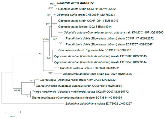 The length of the trimmed and assembled 18S rDNA sequences for strain OAOSH22 was determined to be 1684 base pairs (bp). The sequences obtained as a result of this study have been submitted to GenBank under the accession number OP502635. A BLASTn search was conducted to determine the similarity of the 18S rDNA sequence of strain OAOSH22. The results revealed a high level of identity, with 99.6% similarity (query cover of 100% and E-value of 0), when compared to the 18S rDNA sequence of Odontella aurita (MW750334). Based on the BLASTn search results, we conducted phylogenetic analyses using maximum likelihood (ML), and Bayesian inference (BI) methods were used to confirm the taxonomic classification of strain OAOSH22 within the order Eupodiscales, which includes the genus Odontella. Strain OAOSH22 exhibited a close relationship with O. aurita, as evidenced by strong bootstrap values (ML bootstrap = 98% and BI posterior probabilities = 100%) (Figure 2). Finally, the strain OAOSH22 was identified as Odontella aurita via the analysis of morphological characteristics and sequencing data. The strain was deposited in the Korean Collection for Type Cultures (KCTC 15114BP).