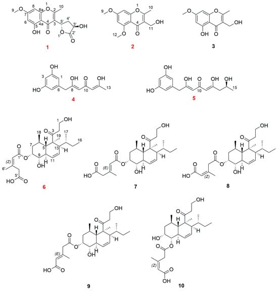 As part of our ongoing research for bioactive compounds from mangrove endophytic fungi [,,], the study on chemical constituents of the ethyl acetate (EA) extract of the culture media of fungus Trichoderma lentiforme ML-P8-2 led to the isolation of ten polyketides (Figure 1), including five undescribed compounds (1–2 and 4–6) and five known compounds (3 and 7–10). The known compounds were identified as 5-hydroxy-3-(hydroxymethyl)-7-methoxy-2-methyl-4H-chromen-4-one (3) [], trichoharzin (7) [], tandyukisin D (8) [], tandyukisin G (9) [], and tandyukisin C (10) []. Antimicrobial, acetylcholinesterase (AChE) inhibitory, and cytotoxic activities of all isolated compounds were tested.