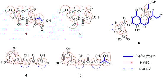 Two-dimensional NMR correlation signals of new compounds 1, 2, 4–6.
