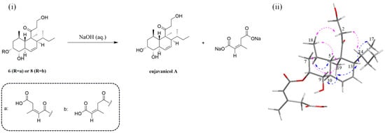 (i) alkali-hydrolysis reactions of compounds 6 and 8; (ii) key NOESY correlation signals of 6.