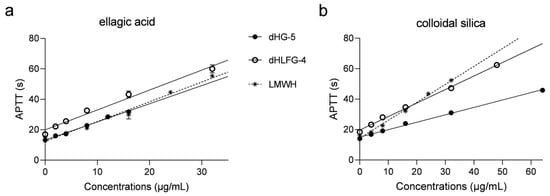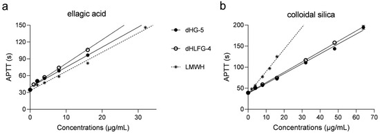 In the process of developing new drugs, the evaluation of efficacy through appropriate assay systems is of great importance. As part of routine laboratory screening tests conducted worldwide, the suitability of various APTT reagents for different anticoagulants, including heparin, dabigatran, and rivaroxaban, has been assessed [,,,]. However, the applicability of these APTT reagents in assessing the anticoagulant effect of FG compounds has not been reported. Recently, for the purpose of choosing suitable APTT reagents used in Phase I clinical trials (CTR20223258, http://www.chinadrugtrials.org.cn/clinicaltrials.searchlist.dhtml, accessed on 19 December 2022), we have performed a parallel measurement on two commercially available APTT reagents (ellagic acid and colloidal silica APTT reagents). The purpose of this study is to evaluate their sensitivity in assessing the APTT prolongation of dHG-5 utilizing a semi-automated coagulometer. Moreover, we elucidated the underlying mechanism responsible for the observed discrepancy. In order to demonstrate the universality of sensitivity for FG compounds, dHLFG-4—another depolymerized FG from Holothuria leucospilota with a Mw of 5.20 kDa—was used for comparation. The results revealed that the sensitivity of dHG-5 and dHLFG-4 towards the ellagic acid APTT reagent was found to be twice that of the colloidal silica APTT reagent, which may be attributed to the comparatively weaker impact of the ellagic acid APTT reagent on the anti-iXase activity of dHG-5 and dHLFG-4 compared with the colloidal silica APTT reagent.