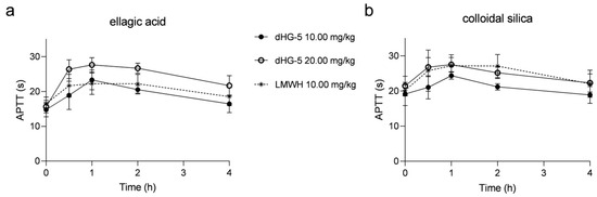 The prolongation of APTT at different time points in rats treated with dHG-5 and LMWH: APTT analysis using ellagic acid (a) and colloidal silica (b) APTT reagents. (n = 6–8, mean ± SD).