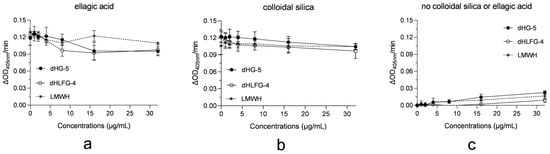 To clarify the factors related to the differences in APTT prolongation potency of dHG-5 and dHLFG-4 caused by colloidal silica and ellagic acid APTT reagents, we assessed the impact of dHG-5, dHLFG-4 and LMWH on these APTT reagents for activating human coagulation control plasma. The results demonstrated that dHG-5, dHLFG-4 and LMWH exhibited negligible activation and had minimal impact on the activation of ellagic acid and colloidal silica APTT reagents in human coagulation control plasma (Figure 4). This suggests that the impact of dHG-5 and dHLFG-4 on human plasma activation by APTT reagents may not be the primary determinant for the observed differences in APTT prolongation potency of dHG-5 and dHLFG-4 when using colloidal silica or ellagic acid APTT reagents.