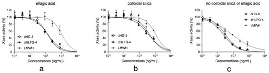 The impact of APTT reagents on the anti-iXase activity of compounds. The anti-iXase activity of dHG-5, dHLFG-4 and LMWH with the ellagic acid APTT reagent (a), the colloidal silica APTT reagent (b), and without ellagic acid or colloidal silica APTT reagents (c). (n = 2, mean ± SD).