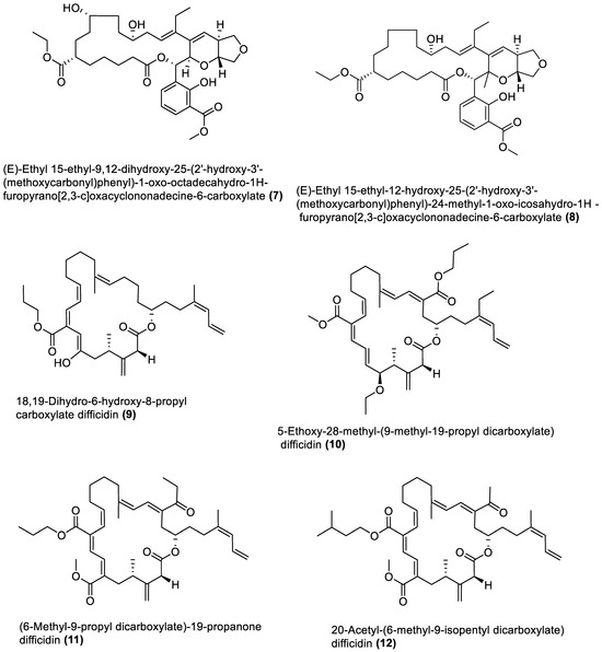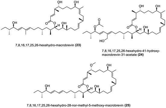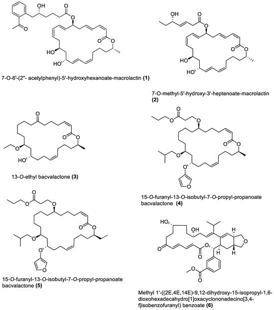 Twenty-five macrolides belonging to different classes have been isolated from marine macroalgae Bacillota, including derivatives of macrolactin (1, 2, 13–21) [73,91], bacvalactone (3–5), elansolid (6–8) [95,96,97], difficidin (9–12) [101], and macrobrevin (22–25) [102]. Compounds 1 and 2 are 24-membered macrolactins isolated from B. subtilis of a brown alga, Anthophycus longifolius [89,91]. They are biosynthesised by the type-1 pks gene cluster through decarboxylative Claisen condensation, ketoreduction, dehydration and cyclisation reaction steps for 1. The bacvalactones (3–5) and elansolids (6–8), which are also biosynthesised by several decarboxylative Claisen condensation reactions, were isolated from a strain of B. amyloliquefaciens of a red alga, Hypnea valentiae. The bacvalactones are 24-membered macrolactones with 13-O-ethyl (3) and 15-O-furanyl (4 and 5) substituents. The elansolids are 19-membered macrocyclic lactones which contain octahydroisobenzofuran derivative (6), 4a,5,7,7a-tetrahydro-2H-furo[3,4-b]pyran derivative (7) and hexahydro-2H-furo[3,4-b]pyran derivative (8) in their structure. In addition, 22-membered difficidin (9–12) and macrobrevin (22–25) analogues, isolated from Kappaphycus alvarezii’s (a red alga) B. amyloliquefaciens, are also the products of repeated decarboxylative Claisen condensation reactions of the pks gene clusters. Other macrolides of marine algae Bacillota are a set of macrolactins (13–21) isolated from a red alga (Schizymenia dubyi) Bacillus sp. All these macrolides were tested only for antibacterial properties, even though they have been reported elsewhere to possess anticancer, neuroprotective, antidiabetic and anti-inflammatory properties [107].