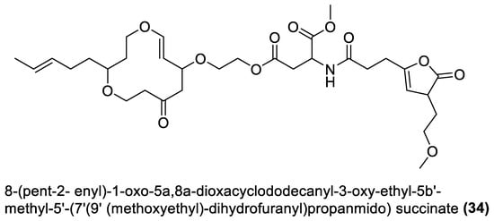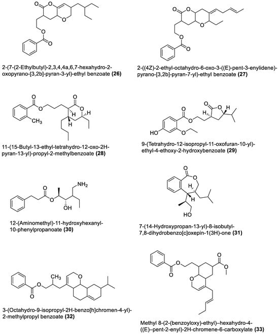 Different previously undescribed derivatives of heterocyclic (26–29 and 31–34) and aliphatic (30) esters have been isolated and characterised from Bacillota of macroalgae (Figure 2). For example, compounds (26 and 27), isolated from B. subtilis of Sargassum myriocystum, are pks-1 gene products and members of the pyranyl benzoate analogues [92]. They are synthesised through the Claisen condensation, dehydration and ketoreduction pathways, and resemble two compounds isolated from the alga host. On the other hand, B. amyloliquefaciens, isolated from Padina gymnospora (a brown alga), produced polyketides (28–31) through the pks-1 gene cluster [94]. The heterocyclic esters (32 and 33), which are octahyrobenzopyran derivatives and the secondary metabolites of B. amyloliquefaciens, isolated from a red alga, Laurencia papillosa, are also pks gene products [105]. In addition, the macrocyclic diester (34), isolated from B. velezensis of Laurencia papillosa (a red alga), also belongs to the pks-1 gene products [103]. Like the macrolides, these nine esters were only tested for antibacterial properties.