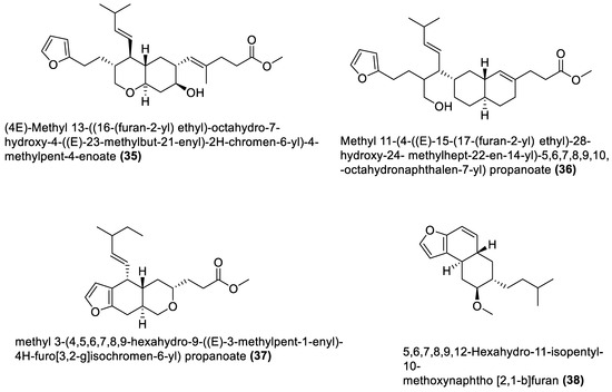 Furanoterpenoids are a class of terpenoids containing at least a furan ring [109]. Many furan-containing compounds, including furanoterpenoids, are toxic to humans. Their toxicity is through the cytochrome P450-catalysed oxidation of the furan ring to two reactive electrophilic intermediates that can bond with macromolecules and cause toxicity [110,111]. However, furanoterpenoids have been reported to elicit anti-inflammatory [112], antimalarial [113], and other properties [111]. Furanoterpenoids (35–38) isolated from B. subtilis of red alga (Anthophycus longifolius) showed in vitro antibacterial effects [90]. Two were sesterpenoid-type compounds (35, 36), and the others were furan annulation compounds. However, considering the toxicity concern regarding this group of compounds, an in vivo toxicity assay of any furan-containing molecule would be necessary, using an animal model, to ascertain their safety. The four furanoterpenoids are biosynthesised by the pks gene cluster.
