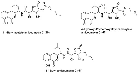 Amicoumacins are derivatives of the dihydroisocoumarin class of compounds biosynthesised by bacterial non-ribosomal peptide–polyketide (nrp-pk) hybrid biosynthetic pathway [114]. Out of the forty-one natural products of the macroalgae Bacillota, the amicoumacins (39–41) are the only chemical compounds produced by another gene cluster other than the pks, even though non-ribosomal peptides synthetase (nrps) gene clusters are quite common in Bacillus species [101,115]. There is, therefore, a need to explore different biosynthetic pathways of macroalgae Bacillota for diverse bioactive chemical species. The structures of 39–41 are shown in Figure 4, and they were isolated from the B. amyloliquefaciens of a red alga, Hypnea valentiae [98]. Although amicoumacins have been reported to possess varying biological effects such as antibacterial, anti-ulcer, anti-inflammatory and cytotoxic effects [116], in our survey of amicoumacins produced by macroalgae Bacillota, only antibacterial effects were reported.