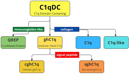 One of the first reviews devoted to C1qDC proteins presents their structural classification [38], and this remains relevant with only one exception, which is modified by us in accordance with recent research (Figure 1). In general, C1qDC proteins are divided into globular head C1q (ghC1q) and C1q-containing collagen domain. The last one includes C1q and C1q-like proteins. Globular head C1q are divided into cellular proteins (cghC1q) and secretory proteins (sghC1q), which contain a signal peptide. Recently, proteins with N-terminal immunoglobulin-like motifs and C-terminal C1q domains have been found in Lophotrochozoa. They were named C1q-related proteins (QREPs) and classified as a new subfamily of variable immunoglobulin-bearing lectins [24]. Database analysis showed that QREPs are present only in the gastropods Heterobranchia and Caenogastropoda. Moreover, in Heterobranchia, QREPs are few in number, non-polymorphic, and represented by a combination of a C1q domain with a single immunoglobin-like domain. In contrast, in Caenogastropoda, QREPs have undergone massive expansion and may include either one or several immunoglobin-like domains [24]. This new subfamily of C1qDC proteins was additionally included in the modified diagram presented in Figure 1.