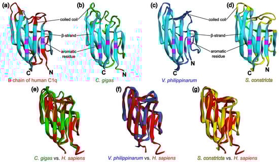 To confirm the concept of similarity of the tertiary structures of C1qDC proteins, we modeled the structures of the p1-CgC1q from C. gigas, VpC1qDC3 from V. philippinarum, and ScghC1q-1 from S. constricta proteins by homology-based modeling server SWISS-MODEL [89] followed by their superposition full-atom structures on the modeled B chain of human C1q to determine the structural homology coefficients. It turned out that the modeled proteins have a typical jelly roll topology similar to the B chain of human C1q consisting of a ten-strand β-sandwich formed by two antiparallel five-strand sheets. Based on the modeling results, it becomes apparent that the conservative aromatic residues Phe97, Phe115, Tyr126, Phe133, Tyr141, Phe143, and Phe215 responsible for the formation of the hydrophobic core of the B chain of human C1q correspond to Phe51, Phe70, Tyr83, Phe90, Tyr98, Phe100, and Phe176 in p1-CgC1q from C. gigas, to Phe82, Phe101, Tyr112, Phe119, Tyr127, Phe129, and Phe201 in VpC1qDC3 from V. philippinarum, and to Phe23, Phe41, Tyr52, Phe59, Tyr67, Phe69, and Phe145 in ScghC1q-1 from S. constricta. As it appears, functional diversity of C1qDC proteins is ensured by variable coiled coil regions (Figure 3a–d). Comparisons of p1-CgC1q from C. gigas, VpC1qDC3 from V. philippinarum, and ScghC1q-1 from S. constricta with the B chain of human C1q using the TM-align method [90] were obtained, with TM values of 0.81018, 0.86206, and 0.84414, respectively (Figure 3e–g), which suggest generally the same fold of C1qDC proteins (TM-score > 0.5). EzMol web server was used to visualize the superposition of protein structures [91].