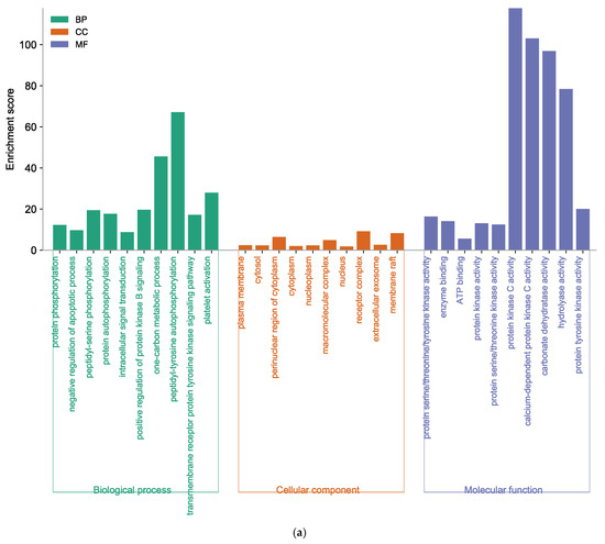 Function of targets with gene ontology (GO) enrichment analysis of (a) EK, (b) DK, and (c) BK. The biological process (BP), cell composition (CC), and molecular function (MF) of the GO enrichment analysis are represented by green, orange, and blue columns, respectively.