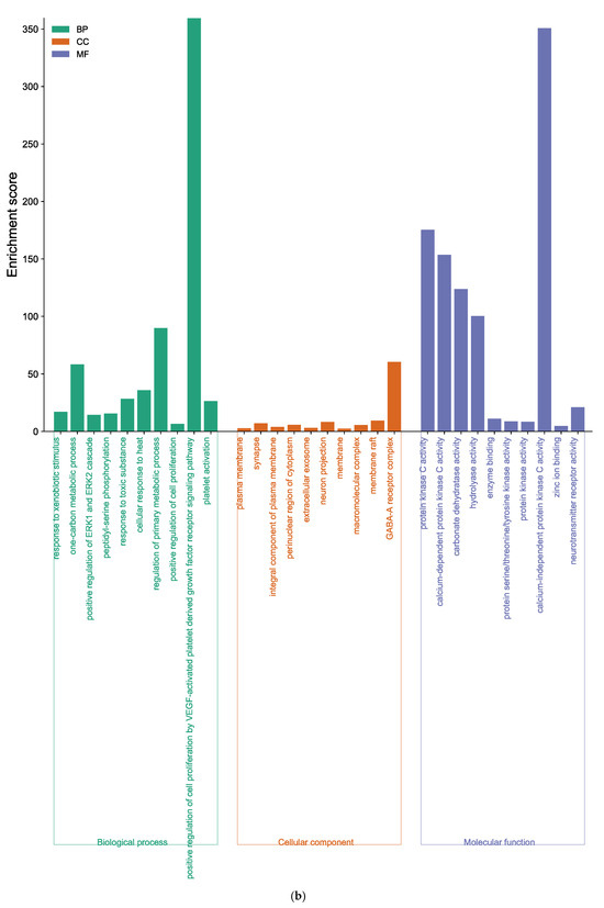 GO analysis of DK-anti-AD showed that 155 BP terms, 42 CC terms, and 59 MF terms were enriched (Supplementary Tables S6–S8). The core targets of DK were involved in response to xenobiotic stimulus, the one-carbon metabolic process, positive regulation of ERK1 and ERK2 cascade, etc., in the BP category (Figure 6b). In the CC enrichment analysis, the core targets of DK were mainly found in the plasma membrane, synapse, integral component of the plasma membrane, and elsewhere. The MF analysis of DK suggested protein kinase C activity, calcium-dependent protein kinase C activity, carbonate dehydratase activity, and others.