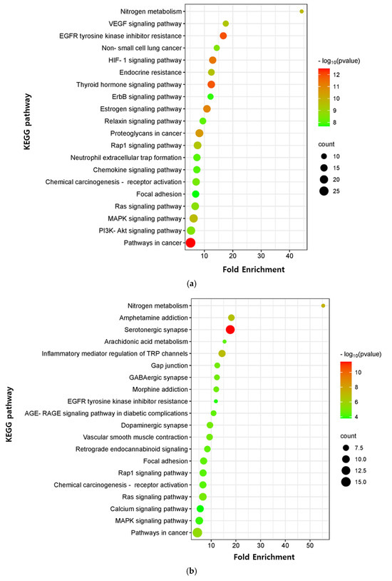 The critical signaling pathway associated with our three compounds in AD was analyzed using the KEGG pathway (Supplementary Table S12). The top 20 pathways were chosen to construct bubble maps with a threshold of p < 0.05 (Figure 7). In total, 150, 75, and 115 significant pathways were exported for EK, DK, and BK, respectively. EK mainly acted on pathways in cancer, EGFR tyrosine kinase inhibitor resistance, and the thyroid hormone signaling pathway, while DK principally affected the serotonergic synapse, nitrogen metabolism, and the inflammatory mediator regulation of TRP channels. KEGG pathways for BK were principally enriched in EGFR tyrosine kinase inhibitor resistance, the HIF-1 signaling pathway, and the Ras signaling pathway. In addition, pathways in cancer, EGFR tyrosine kinase inhibitor resistance, MAPK signaling pathway, Rap1 and Ras signaling pathway, chemical carcinogenesis, and focal adhesion were common pathways for these three compounds (Table 3). It was found that the hub genes of marine polyphenols were closely related to these top 20 pathways, demonstrating these hub genes of our compounds might play a role in AD prevention.