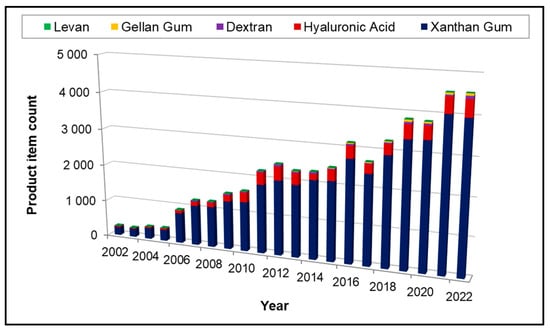 Evolution of new skincare products containing bacterial EPS over 20 years on three markets: France, USA and China, according to a statistical study retrieved from the Mintel’s Global New Products Database (GNPD, Mintel Group Ltd., London, UK) on 18 October 2023 []. Product item count corresponds to filed product sheets (one product per country). INCI names are listed in increasing total product items over 20 years: levan (34), gellan gum (342), dextran (661), hyaluronic acid (4764) and xanthan gum (39,613).