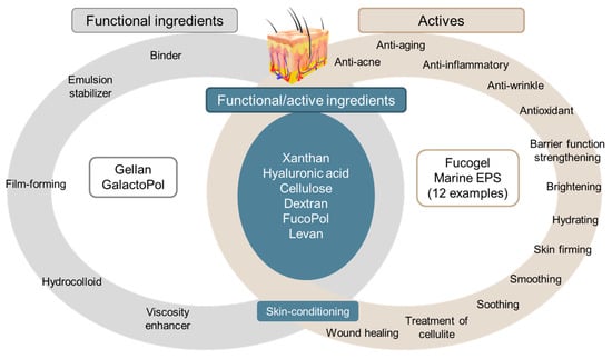 In recent years, a global tendency has emerged for healthier, more environmentally sustainable, and ecologically friendly products, leading to higher investments in the research and development of innovative natural extracts by cosmetic companies []. In response to the increasing demand of naturality by consumers, companies interest increases for bio-based ingredients that can be obtained using green solvents and eco-friendly processes []. Bioactive natural products are usually extracted from terrestrial and marine plants as well as microorganisms. However, biotechnology-derived compounds have reproducible composition and structural features, independently of season and climate []. Polysaccharides exhibit unique functional properties interesting for cosmetic applications, including gelling, thickening and emulsifying properties. Long dominated by polysaccharides of terrestrial or marine plants, the market has also opened to bacterial EPS and new carbohydrates are continuously under investigation as the polysaccharide market is still expanding. Bacterial EPS comply with the required degree of purity for high value market applications. In cosmetic formulations, polysaccharides are also used as actives, due to their biological properties. Market demand is mainly focused on molecules acting on aging process such as anti-wrinkle agents, molecules which reduce skin thickness and improve skin elasticity, moisturizing compounds, anti-acne molecules, skin depigmentation compounds, UV filters, anti-inflammatory compounds, antioxidants, as well as cytoprotective agents [,]. Polysaccharides promote skin feeding, regeneration and maintenance. They account for more than 20% of the molecules used in cosmetics, presenting mainly moisturizing, smoothing, anti-wrinkle activity, whitening, cell repair or regeneration activities, or UV protection []. Polysaccharides can be used as humectants to promote a moist environment for the skin [].