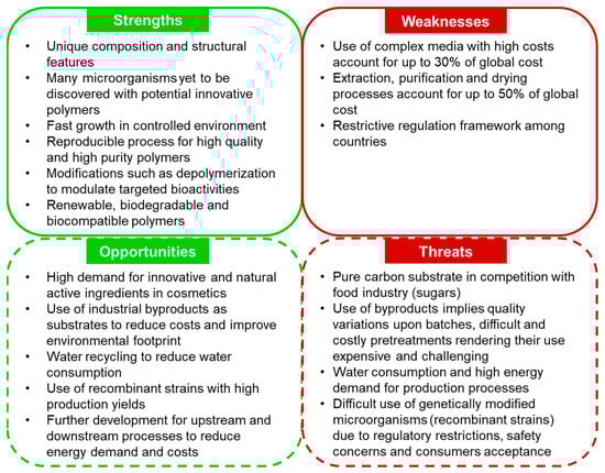 Other recent advances rely on the use of “-omics”, a set of tools and methods used for metabolic engineering and synthetic biology. Metabolic engineering aims to optimize metabolic pathways for the microbial synthesis of a compound of interest of a specific organism, from a substrate, while generating the maximum production rate and avoiding inhibitors and conditions affecting the growth rate. Metabolic fluxes manipulation is based on databases, libraries of components and growth conditions. Metabolic engineering was already used to optimize hyaluronan, alginate and some other EPS production (Lactococcus sp., Sphingomonas sp., Streptococcus sp.), allowing to obtain higher yields and lower synthesis costs compared to natural production of these strains [,]. Synthetic biology aims to assemble genetic pathways in heterologous hosts []. However, recombinant technologies for compound production in a more efficient heterologous host are highly challenging for heteropolysaccharides and are not easily acceptable in the cosmetic field, making the cost objectives difficult to achieve.