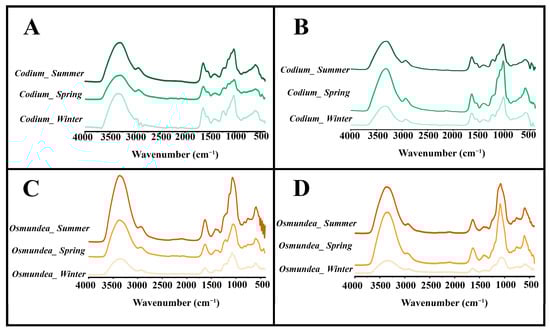 FTIR spectra of polysaccharides extracted from Codium sp. and Osmundea sp. macroalgae in different seasons (winter, spring and summer) from Galician (A,C) and Portugal (B,D) coasts.
