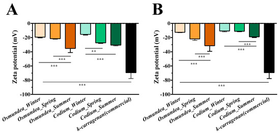 Determination of the surface charge of the polysaccharides extracted from Codium sp. and Osmundea sp. collected in different seasons (winter, spring and summer) from Portugal (A) and Galician (B) coasts. The k-carrageenan polysaccharide was used for comparative purposes. Data are presented as mean ± standard deviation (n = 5), ** p < 0.01, *** p < 0.001.