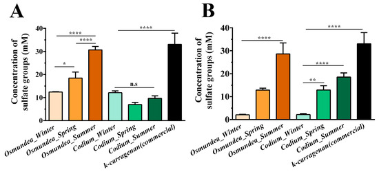 Quantification of the concentration of sulphate groups of the polysaccharides extracted from Codium and Osmundea species collected in different seasons (winter, spring and summer) from the Portugal (A) and Galician (B) coasts. The k-carrageenan polysaccharide was used for comparative purposes. Data are presented as mean ± standard deviation (n = 5), * p < 0.5, ** p < 0.01, **** p < 0.0001, n.s.—not significant.