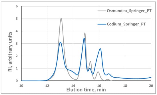 Regarding the algae PSs dissolution, it is worth noting that the dissolution in pure water was relatively low, with dissolution yield in the range of 30–60%, which led us to make the dissolution in a 2.5 mM alkaline aqueous solution, following the work of Wahlström et al. [5]. In fact, under these alkaline conditions, the PS dissolution was very good, with dissolution yields above 85% for both macroalgae PSs. When the alkaline aqueous solution is used as a dissolution solution, the PS concentration should be not higher than 1 g/L to achieve this dissolution. These experimental findings are in agreement with what has been described in the literature for the alginates, which is that solubility can be influenced by factors like pH, concentration, ions in solution and ionic force [31]. Figure 4 illustrates the molecular weight profile of the PSs of the two algae species. The results demonstrate the presence of PS with different molecular weights (several individual peaks at different elution times) in both species. As we can observe in Figure 4, the peaks are practically in the same position (same elution times), suggesting the presence of the same classes of polysaccharides; the differences are at the level of the relative proportion of the different polysaccharides. Regarding repeatability, several GPC runs with the same sample, including with different dilutions, indicated the good performance of the system. A standard deviation of ±0.1 min in the retention time was observed. Unfortunately, it was not possible to associate the several peaks with the corresponding polysaccharides. It should be noted that for assays where higher PSs concentration and water as solvent were used, low dissolution occurred, whereas using water or 20 mM phosphate buffer (pH = 8), some peaks were not separated.